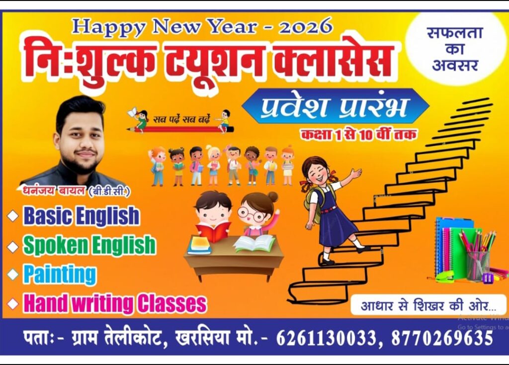 कोरबा: रायगढ़ जिले के खरसिया विकासखंड अंतर्गत ग्राम पंचायत तेलीकोट में शिक्षा को बढ़ावा देने की दिशा में एक सराहनीय पहल देखने को मिल रही है। जनपद सदस्य एवं युवा नेता धनंजय बायल के सौजन्य से गांव के कक्षा पहली से दसवीं तक के विद्यार्थियों के लिए निशुल्क ट्यूशन क्लास की शुरुआत की गई है। इस पहल का उद्देश्य ग्रामीण क्षेत्र के बच्चों को बेहतर शैक्षणिक मार्गदर्शन उपलब्ध कराना और शिक्षा के प्रति उनकी रुचि को प्रोत्साहित करना है।
